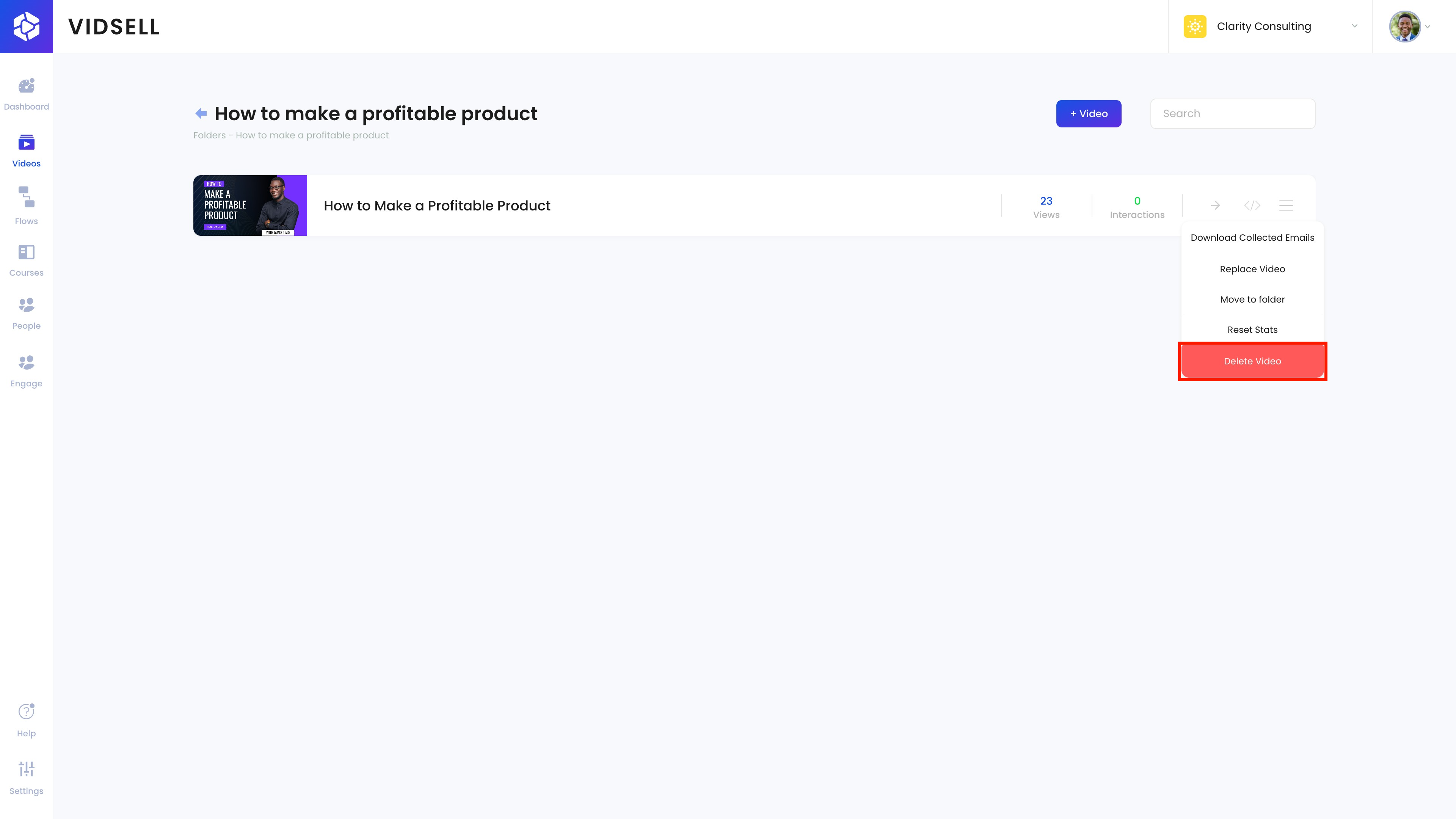Confirm that you would like to delete your video. This will remove your video from any associated courses, flows, or communities, as well as where your video is being used online through the VidSell embed code.